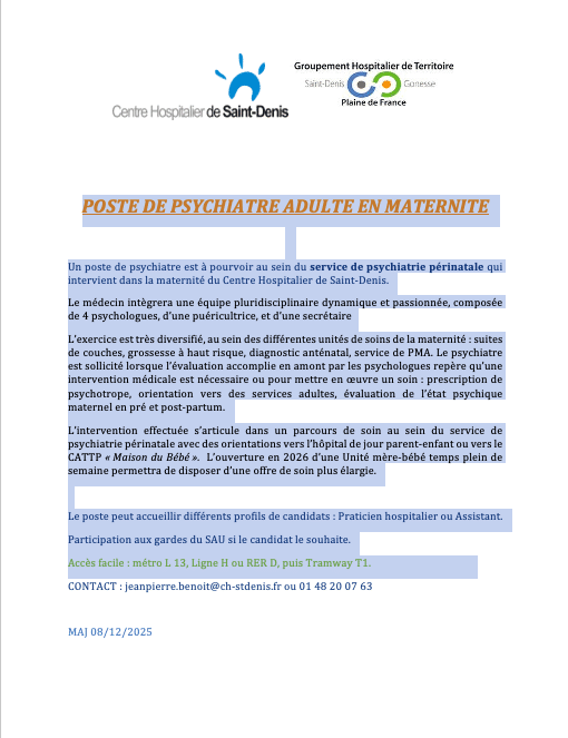 Un poste de psychiatre adulte est à pourvoir au sein du service de psychiatrie périnatale qui intervient dans la maternité du Centre Hospitalier de Saint-Denis. Le médecin intègrera une équipe pluridisciplinaire dynamique et passionnée, composée de 4 psychologues, d’une puéricultrice, et d’une secrétaire L’exercice est très diversifié, au sein des différentes unités de soins de la maternité : suites de couches, grossesse à haut risque, diagnostic anténatal, service de PMA. Le psychiatre est sollicité lorsque l’évaluation accomplie en amont par les psychologues repère qu’une intervention médicale est nécessaire ou pour mettre en œuvre un soin : prescription de psychotrope, orientation vers des services adultes, évaluation de l’état psychique maternel en pré et post-partum. L’intervention effectuée s’articule dans un parcours de soin au sein du service de psychiatrie périnatale avec des orientations vers l’hôpital de jour parent-enfant ou vers le CATTP « Maison du Bébé ». L’ouverture en 2026 d’une Unité mère-bébé temps plein de semaine permettra de disposer d’une offre de soin plus élargie. Le poste peut accueillir différents profils de candidats : Praticien hospitalier ou Assistant. Participation aux gardes du SAU si le candidat le souhaite. Accès facile : métro L 13, Ligne H ou RER D, puis Tramway T1.